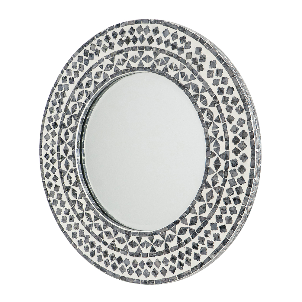Capiz shells make up this amazing patterned mirror. Fresh colors of  charcoal and bright white create a unique look that would finish a mantle or add to a beach house decor.
